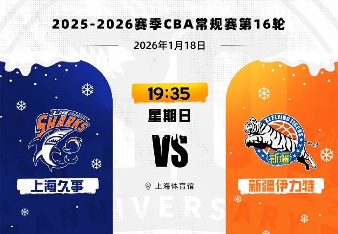 虎扑01月17日讯 据上海男篮官方发文,2026年1月18日,2025-2026赛季CBA联赛常规赛第16轮,上海久事主场迎战新疆伊力特。